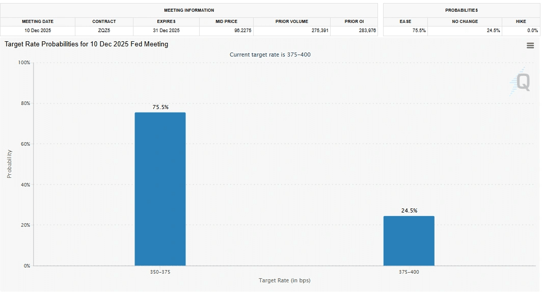 Menurut grafik alat CME FedWatch di bawah ini, orang-orang di pasar cepat bereaksi dan sekarang memperhitungkan kemungkinan 75% bahwa Fed akan menurunkan harga pinjaman di bulan Desember.
