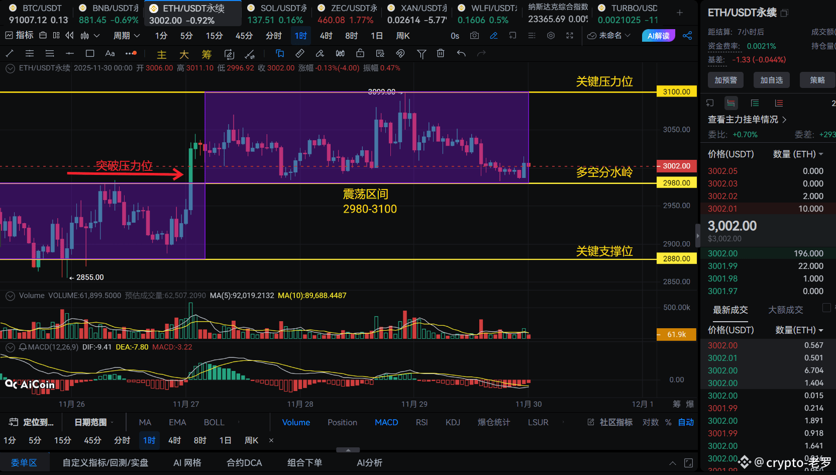 行情磨叽两天了,2980-3100这区间都快被磨出火星子了!1011内幕巨鲸突然砸5倍空单,明显在赌方向——但老罗觉得,这反而可能是烟雾弹,真正的突破往往在大多数人犹豫时爆发!