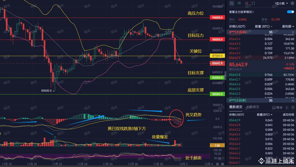 从这张一小时K线图看,BTC行情就像坐滑梯,一根根红绿K线往下窜。MACD指标的白线和黄线都掉在0轴下方,还形成了“死叉”,这是典型的下跌信号,说明空头力量强,短期难翻身。关键点位上看,上方压力重重:94000是高压力,90000是目标压力;下方87000是关键支撑位,如果跌破,可能直接滑向83000附近。简单说,现在市场情绪偏空,反弹乏力,冲9000?难度太大,更像做梦!