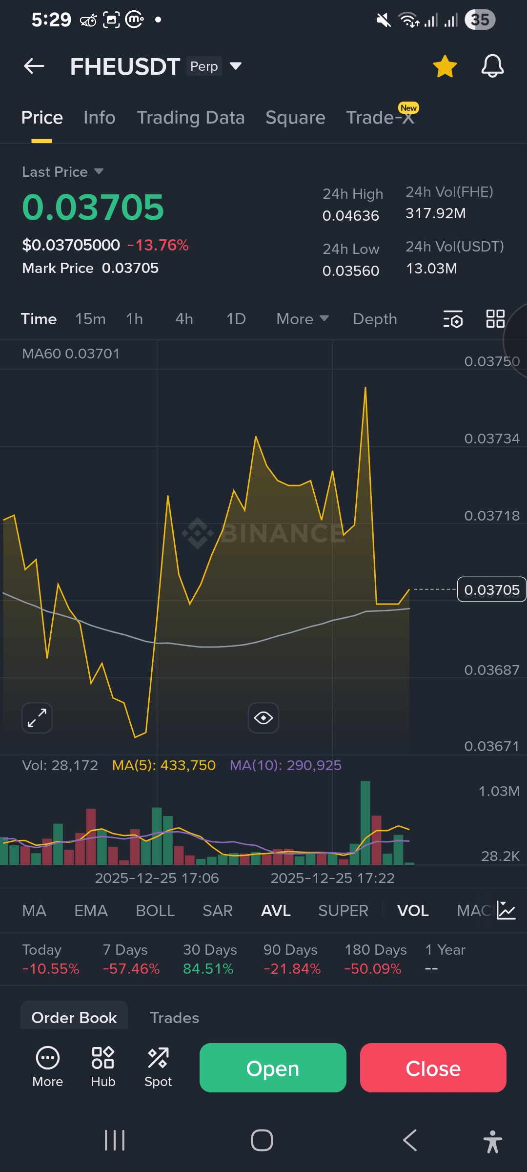 Sementara beberapa laporan berita menyebutkan maksimum 0.14 USDT, saya percaya pada tetap berpegang pada data pasar Binance yang sebenarnya. Saat ini, $FHE diperdagangkan sekitar 0.037 USDT, turun sebesar -13.76%.