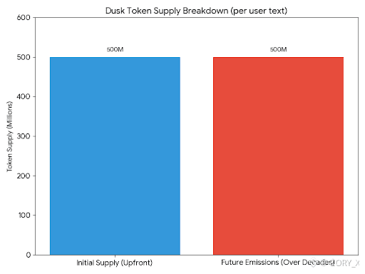 Then theres the money. There is always money. Dusk launched with a fixed supply story that looks neat on paper 500 million tokens upfront another 500 million to be emitted over decades but the lived reality is emissions incentives and selling pressure hitting a thin market day after day. This is not a moral critique. Its arithmetic. Validators get paid in tokens. Teams get paid in tokens. Early backers get liquidity in tokens. Somebody somewhere has to buy those tokens with actual cash or the price slides. Slowly at first. Then all at once.