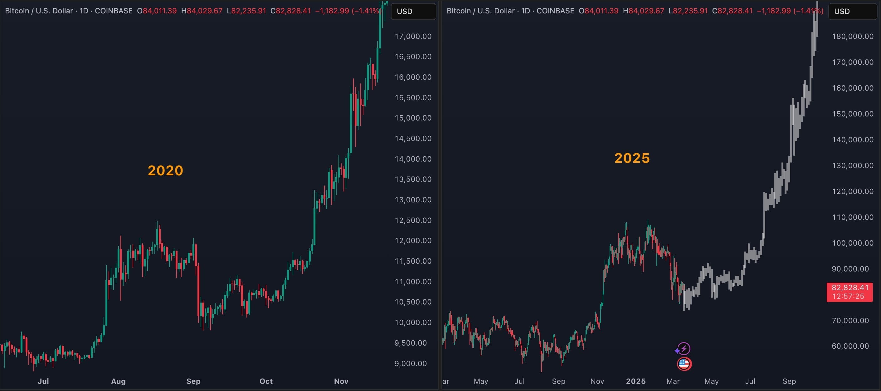 Il grafico indica che Bitcoin ha visto il suo primo aumento quando è aumentato da novembre 2024 a gennaio 2025, raggiungendo un nuovo picco sopra i $109K. Questo è comparabile al grande rally che l'asset ha osservato da luglio ad agosto 2020. Ora, il ritracciamento e la consolidazione attuali somigliano alle difficoltà di Bitcoin da settembre a ottobre 2020.