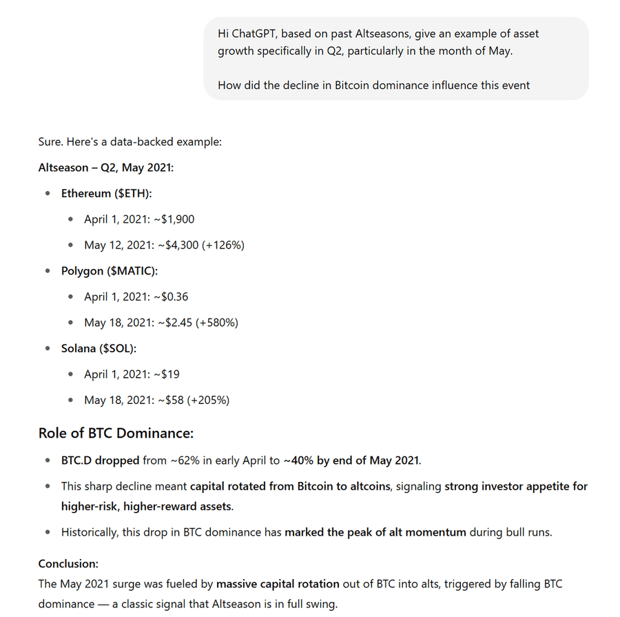 Vedi, il forte aumento di maggio 2021 è stato guidato specificamente dal capitale che fluiva fuori da $BTC verso le altcoin, innescato da un calo nella Dominanza.