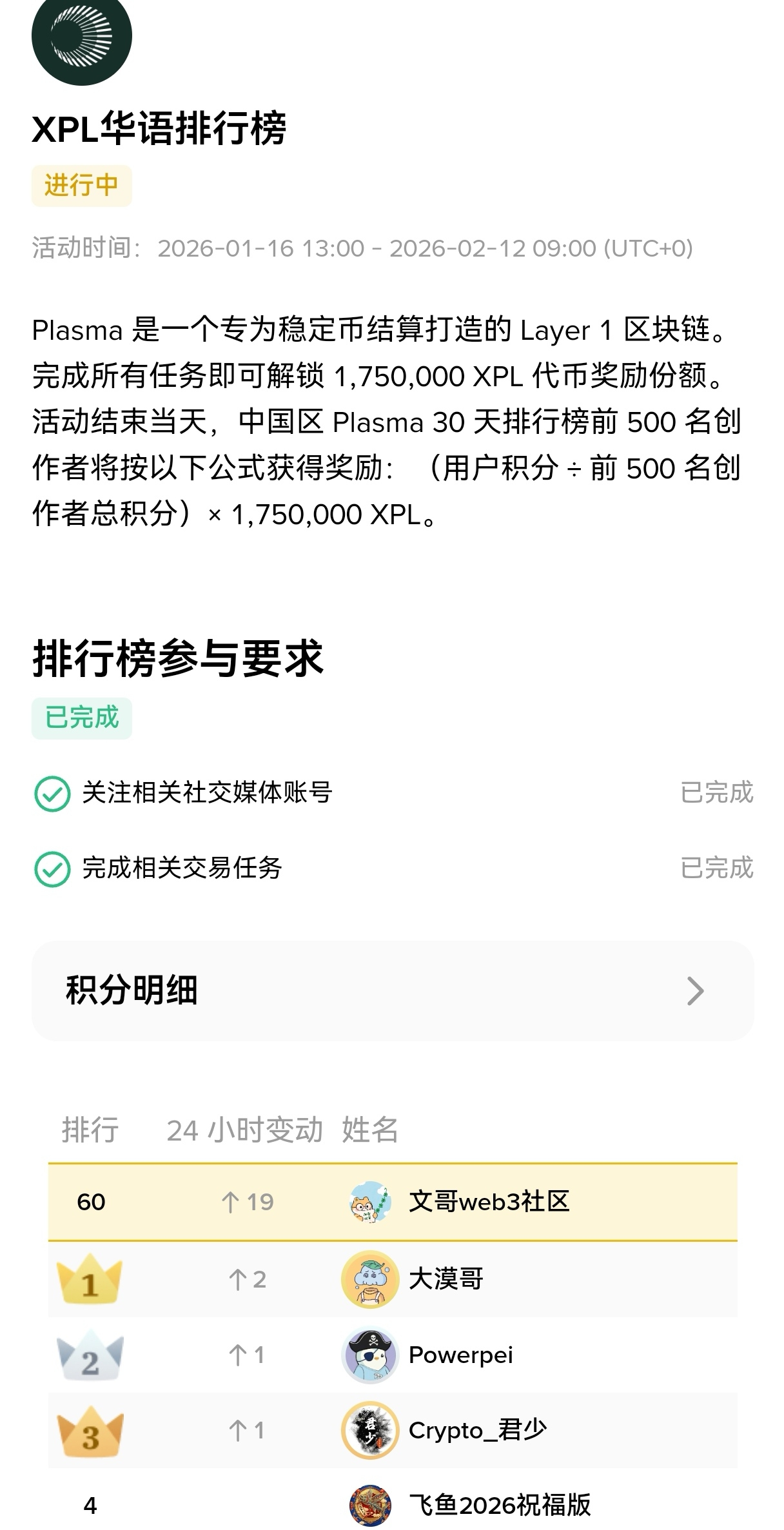 #Plasma 项目我虽然比别人晚参与10天,但现在每天发文,也进入前60了。虽然$XPL 价格低迷,我还是看好@Plasma 这个项目的,稳定币支付是万亿级赛道,相信plasma零手续费结合强大背景优势能站稳板块龙头。