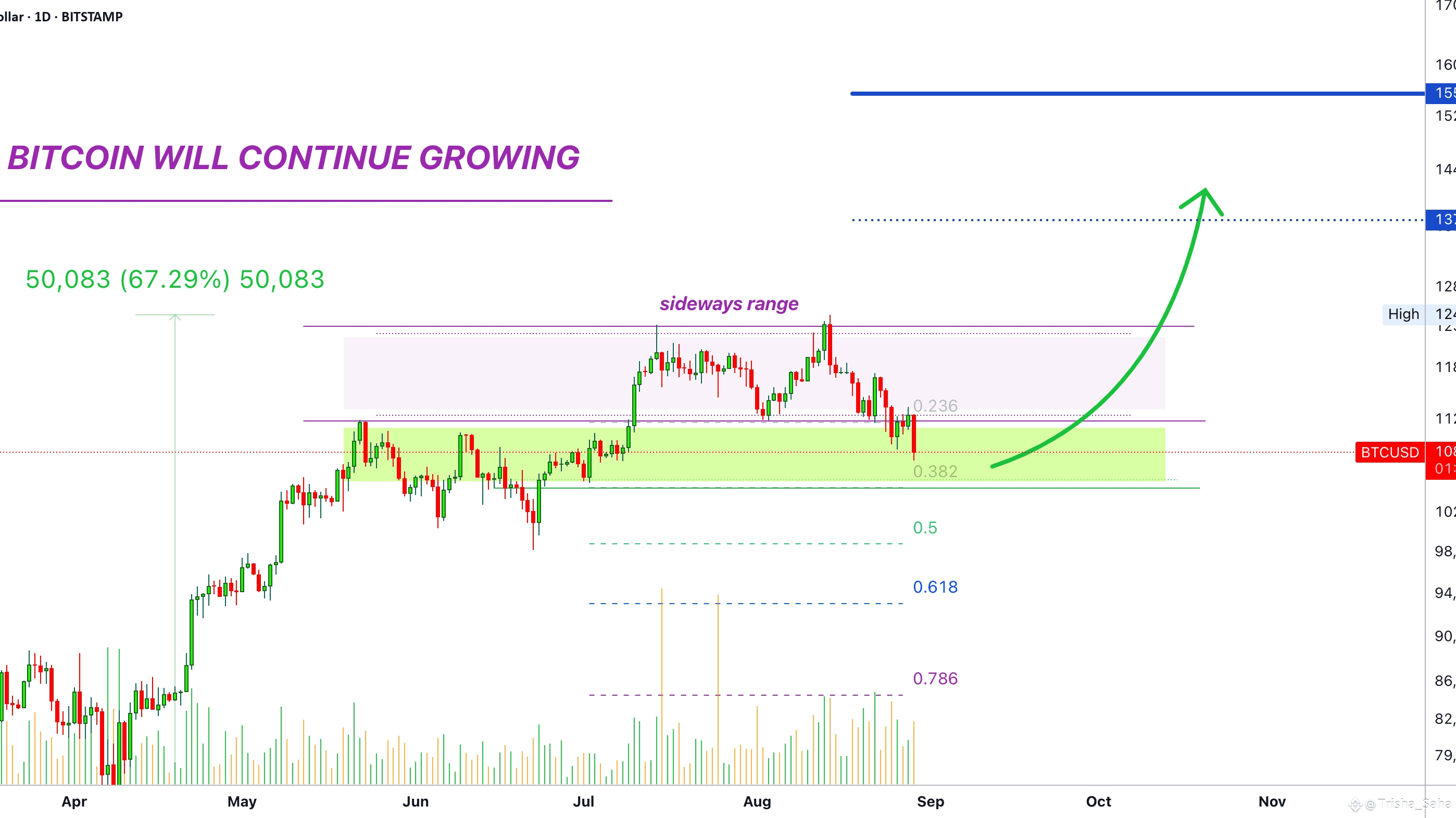Normalmente un ritracciamento penetrerebbe a metà della precedente fascia di consolidamento prima di invertire. Il Bitcoin ha toccato un minimo oggi di $107,488. Il più basso dal 8 luglio.