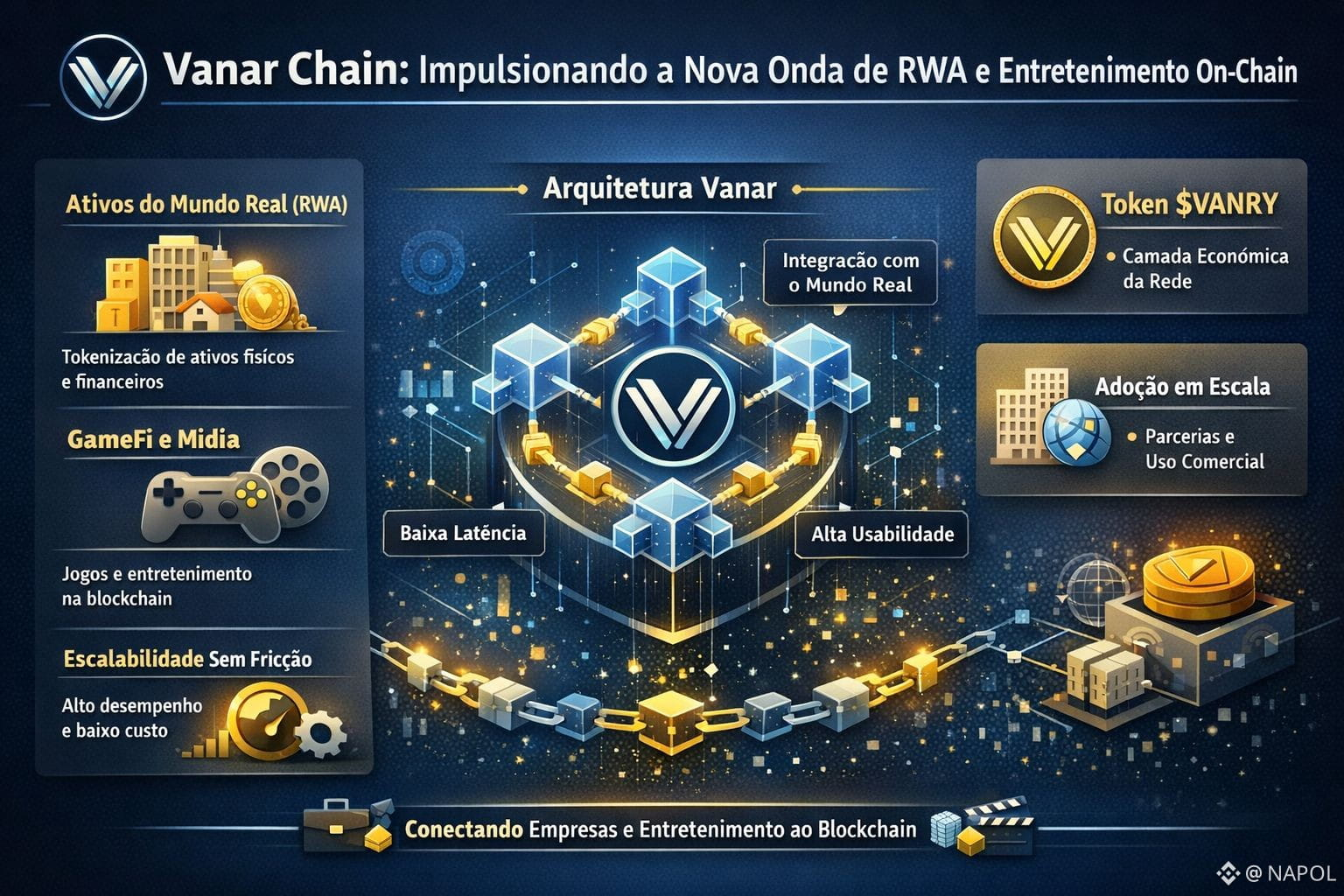 Ao observar o infográfico da Vanar Chain, fica claro que a proposta da rede não é competir por atenção momentânea, mas organizar visualmente uma tese de longo prazo. Cada bloco apresentado RWA, entretenimento, arquitetura e token se conecta a um mesmo ponto central: reduzir a distância entre blockchain e uso real.