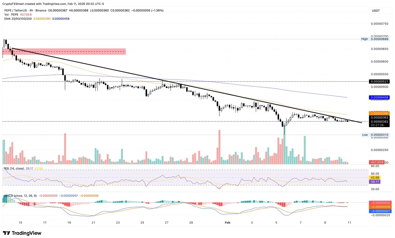 Sul grafico a 4 ore, la moneta meme a tema rana sta invertendo da una linea di tendenza di resistenza verso il minimo del 6 febbraio a $0.00000310.