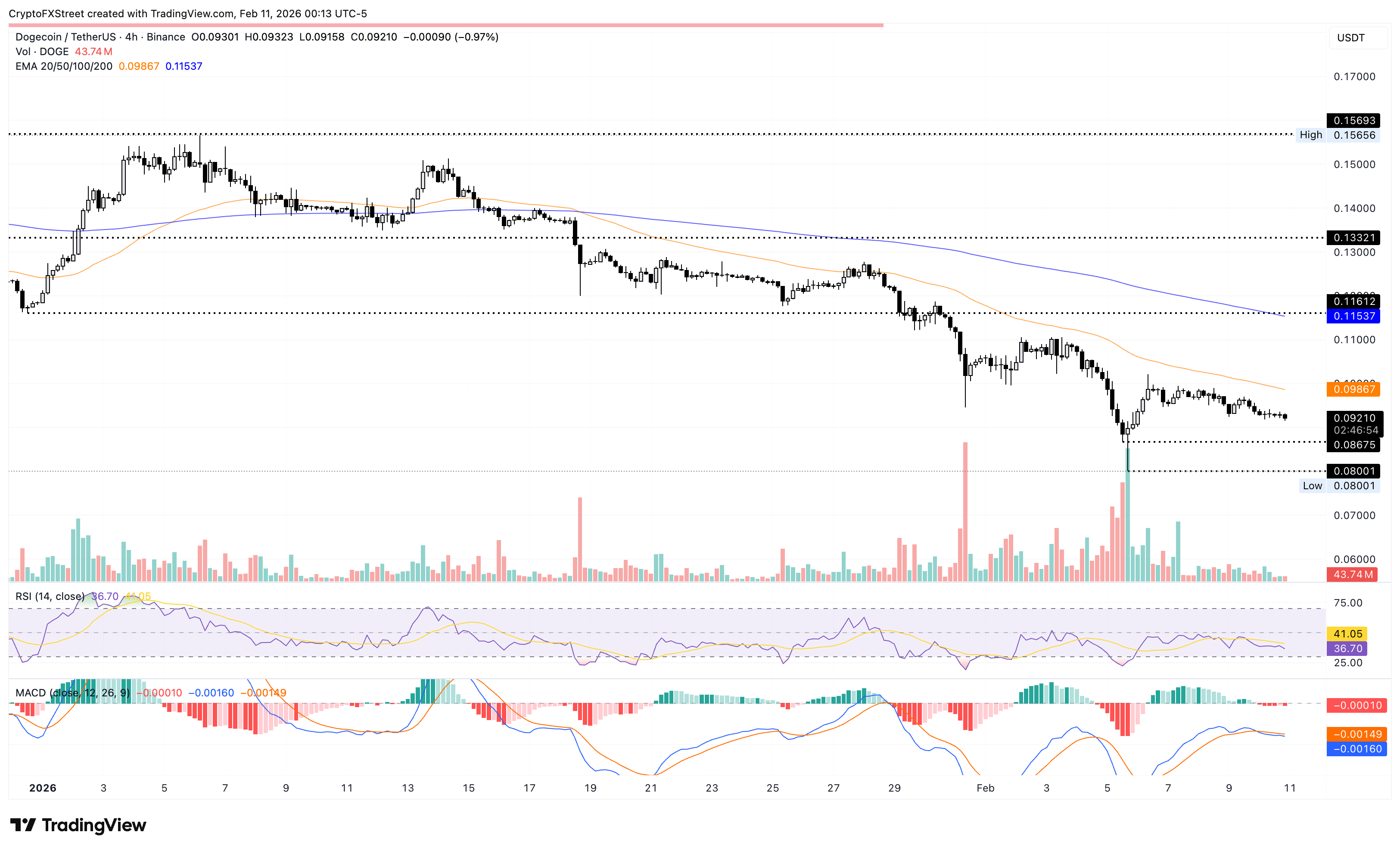 Il supporto immediato per Dogecoin si trova a $0.08675, e una chiusura al di sotto di questo potrebbe estendere il declino al minimo del 6 febbraio a $0.080.