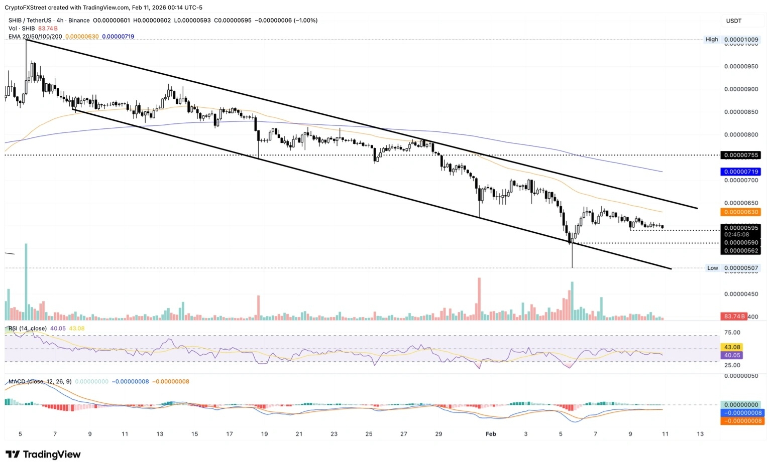 Oltre a questo, il supporto cruciale per SHIB si trova a $0.0000056 e al minimo del 6 febbraio, e a $0.0000051, che coincide con la linea di confine inferiore del modello di canale discendente.
