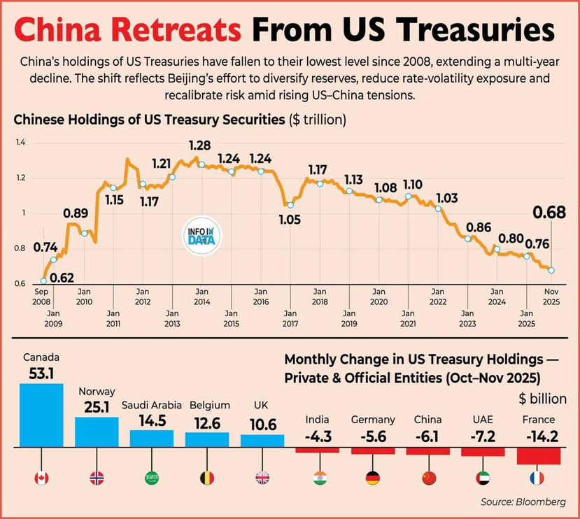 La Cina ha ridotto il portafoglio di obbligazioni del tesoro americano a $0.68 trilioni — il minimo dal 2009. E non è un movimento isolato. È una tendenza che dura da anni.