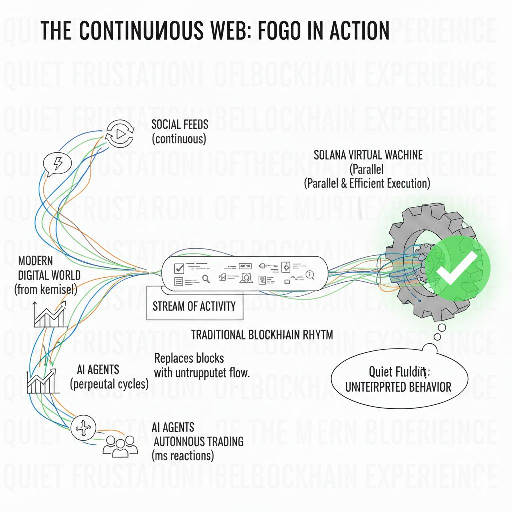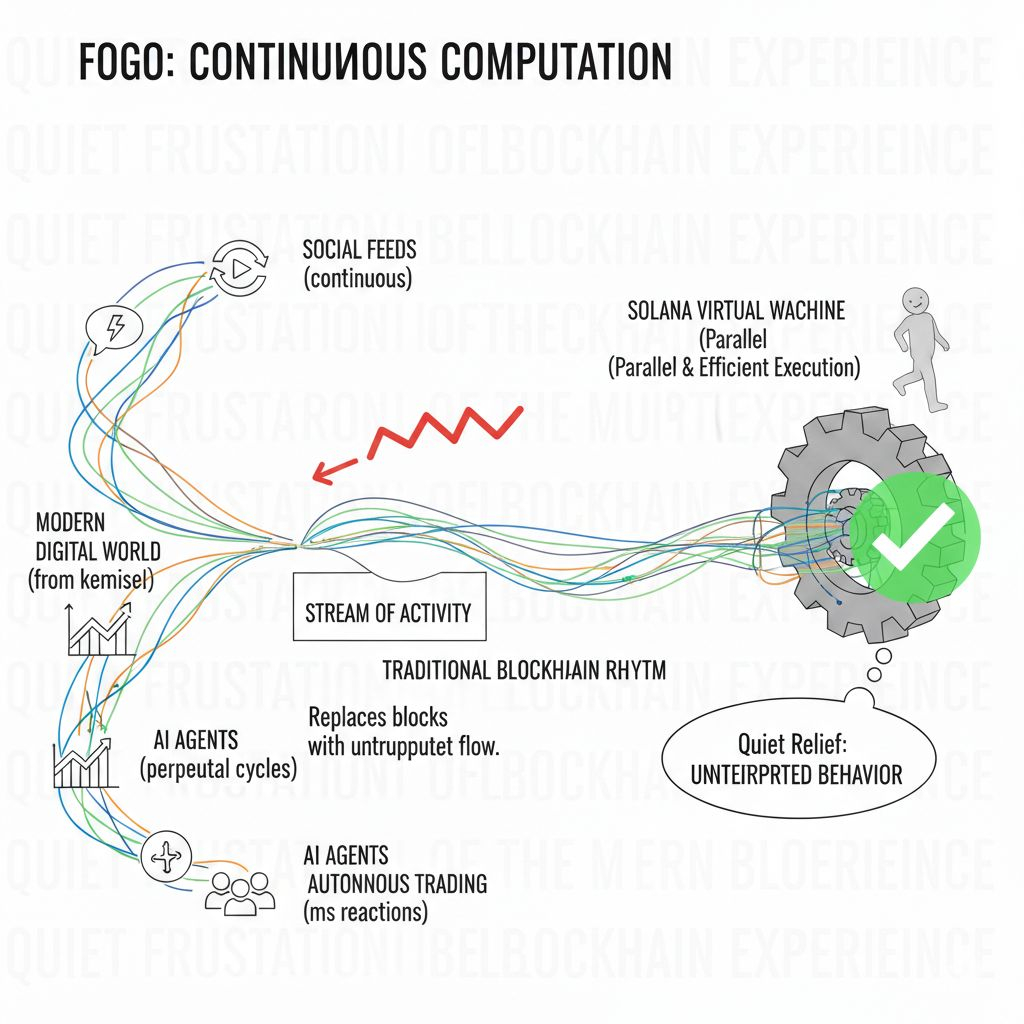 Fogo emerges from that emotional landscape with a different premise. Instead of asking how to increase the number of transactions per block, it asks whether the dominance of blocks themselves should remain unquestioned. Instead of treating activity as isolated events that compete for inclusion, it reimagines activity as a stream that flows continuously. Built upon the performance-oriented foundation of the Solana Virtual Machine, Fogo inherits an execution environment known for parallel processing and efficiency. Yet its ambition goes beyond speed within existing constraints; it seeks to soften those constraints by designing for uninterrupted behavior rather than periodic settlement.