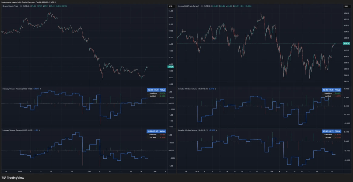 另一条反方逻辑是统计意义上的反驳。宏观交易者 Alex Krüger 的回应被多家报道引用,他的做法是直接把窗口回报拉出来看,结论是“10am 固定砸盘”叙事与数据不一致。他给出的统计口径是,自2026年1月1日以来,IBIT 在 10:00-10:30 时段的累计收益率为+0.9%,而在 10:00-10:15 时段则为-1%。并没有呈现系统性下跌,更有趣的是,这两个窗口中的表现模式与纳斯达克指数的表现模式非常接近。由此认为整体更接近噪声和风险资产同步再定价。