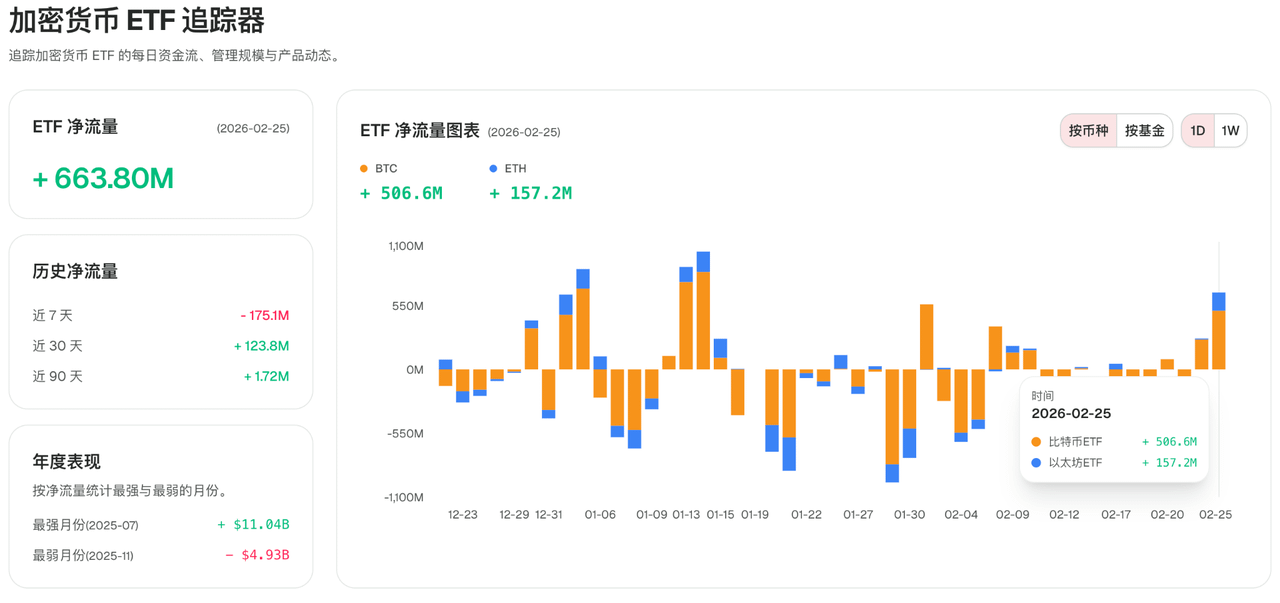 另外还有流量条件,资金在现货与衍生品之间的切换会改变当日的需求侧斜率,它不用于归因“谁在卖”,用于刻画当日需求侧是否提供了更强的承接。以 2026 年 2 月 25 日为例,CoinFound显示当日加密 ETF 合计净流入约 6.64 亿美元,其中 BTC 约 5.07 亿美元、ETH 约 1.57 亿美元。将这一类资金流与价格行为放在同一时间轴上,可以更清楚地区分“需求侧增强导致的企稳”与“单一事件触发的行为变化”两类解释路径。