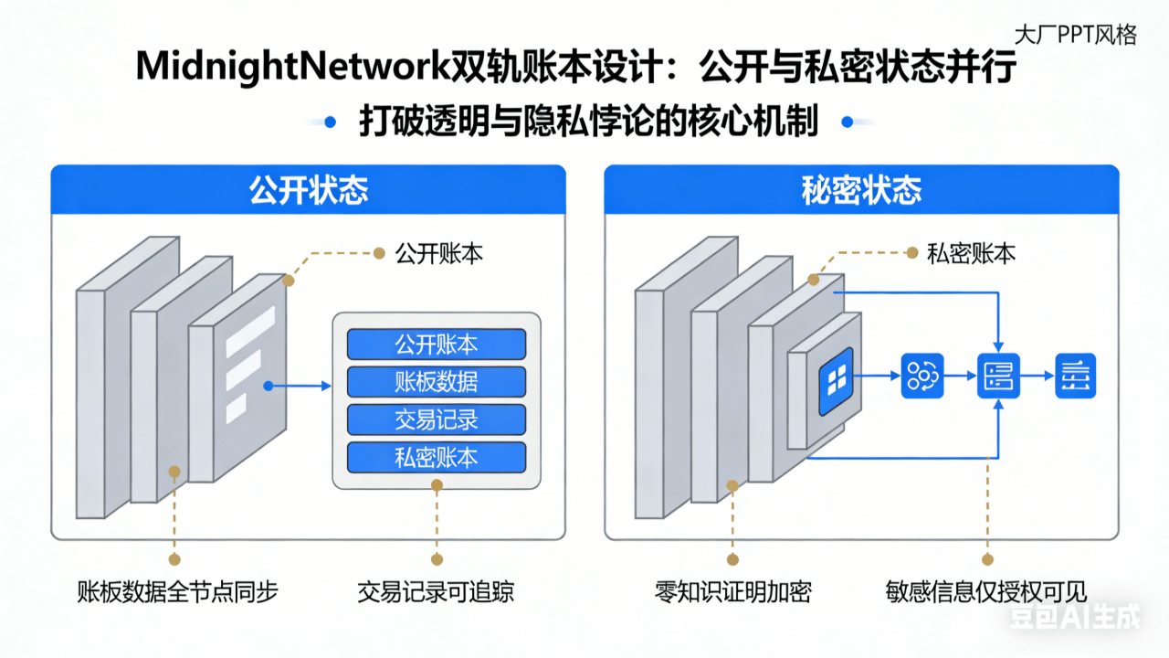 Il design del libro mastro a doppia traccia di MidnightNetwork è la soluzione al dilemma della privacy e della trasparenza nella blockchain. Attraverso una struttura a doppia traccia, consente la coesistenza di decentralizzazione e protezione della privacy, rompendo completamente le limitazioni di trasparenza nelle applicazioni commerciali.