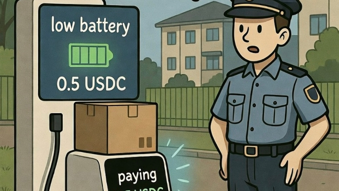 Mi sono avvicinato e ho visto che sullo schermo è comparsa una riga di testo: “Batteria scarica, pagamento di 0.5 USDC in corso, si prevede che la consegna continui dopo la ricarica.”