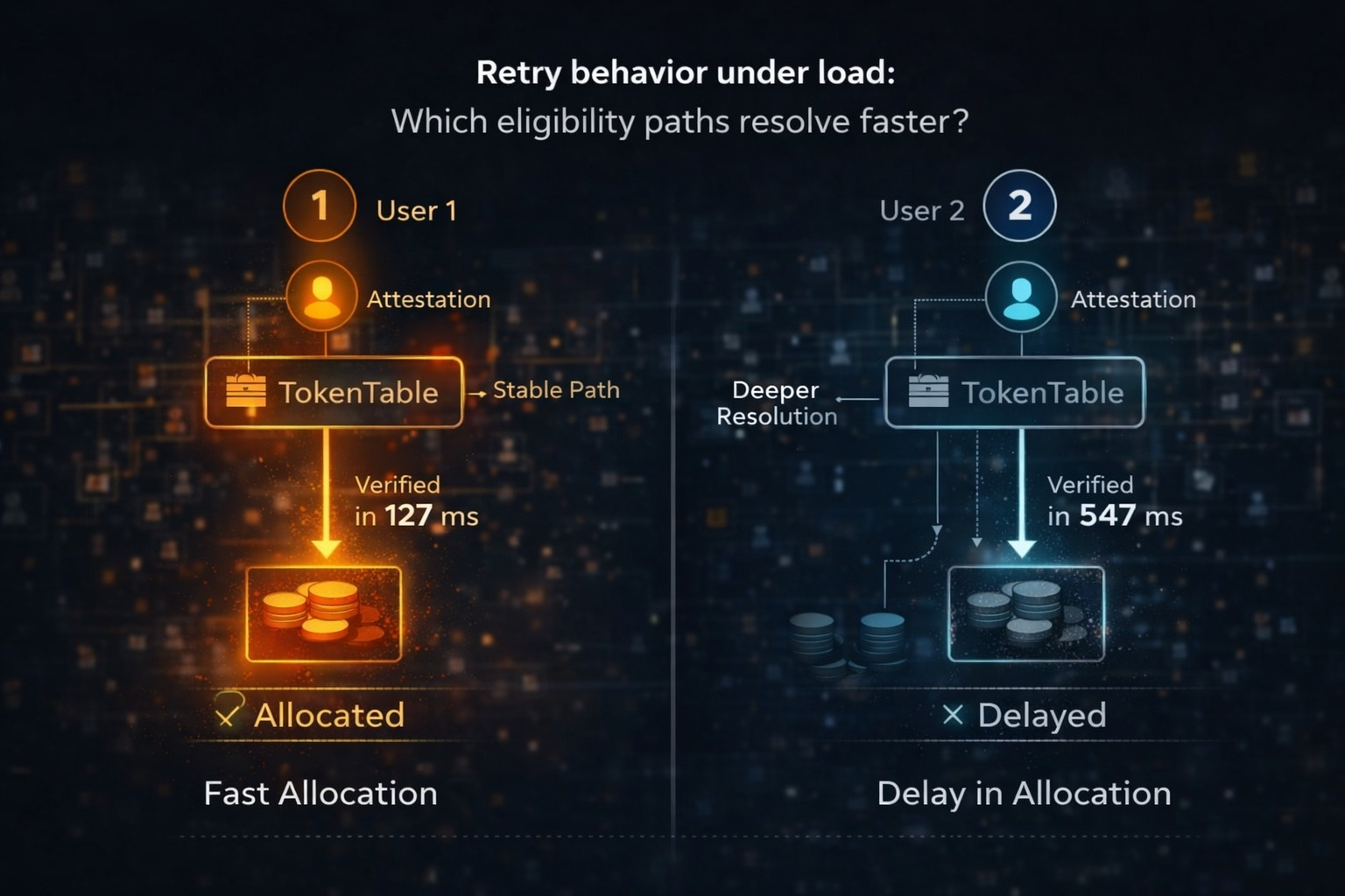Second example. Retry behavior under load. When eligibility queries spike, especially during allocation windows, the system doesn’t just slow down uniformly. Some attestations resolve faster because their issuers are already cached or prioritized within the evaluation graph. Others require deeper resolution, more hops, more checks. In practice, this means two identical users can experience different inclusion timing based purely on how “close” their issuer is to the active routing layer.
