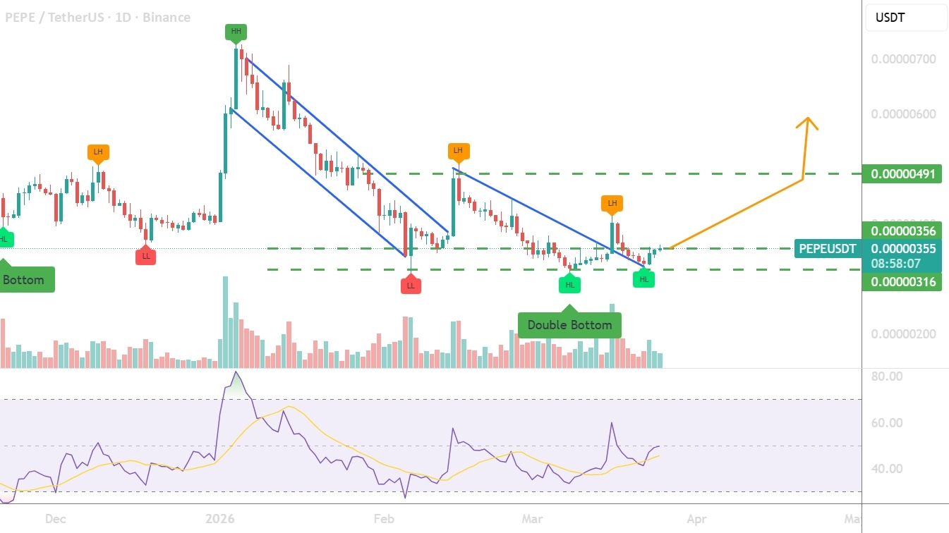 PEPE sta formando un doppio minimo + configurazione di inversione di tendenza sul timeframe giornaliero.