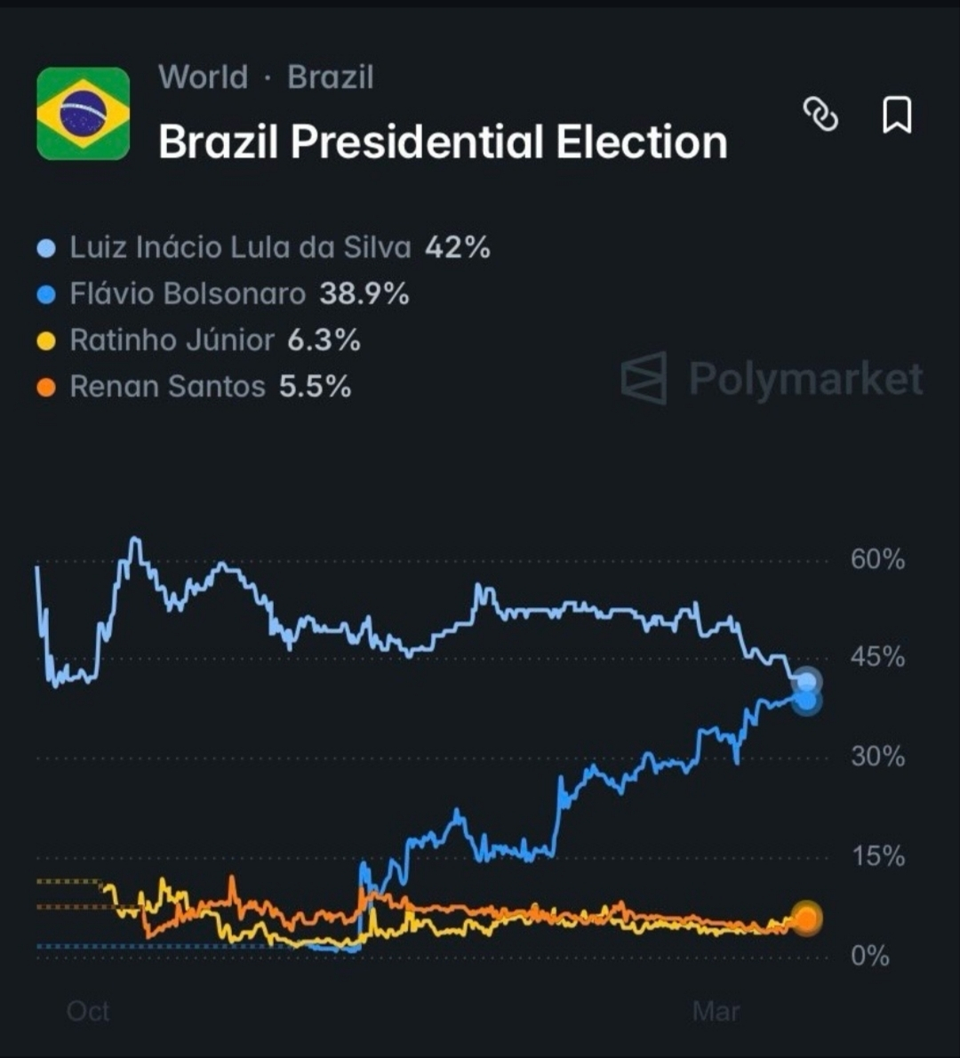 A vantagem de Lula que era gigantesca há poucos meses desapareceu em menos de 90 dias. O mercado preditivo já sente o cheiro de virada.