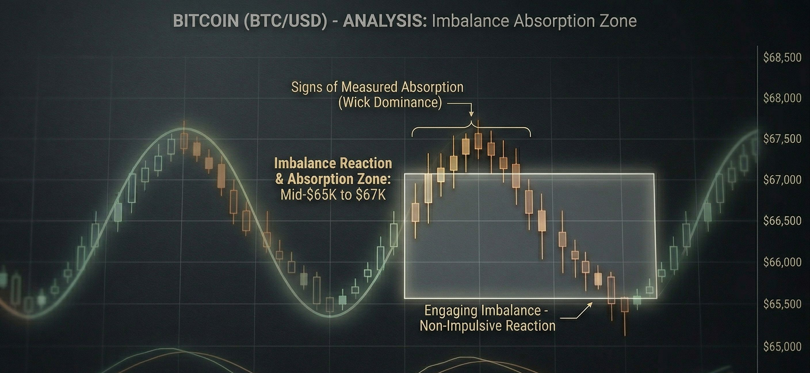 Price has since drifted into a reaction zone around the mid-$65K to $67K area, where the market is engaging with that imbalance left behind during the outflow-driven move. The reaction here isn’t impulsive — it’s measured, with signs of absorption rather than panic-driven continuation.
