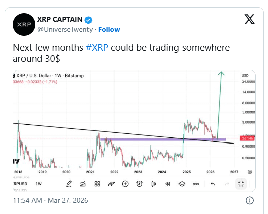 XRP Captain ha rafforzato questa prospettiva con una traiettoria proiettata tracciata sul grafico, mostrando un'espansione rapida del prezzo una volta che il livello di resistenza è superato. La proiezione si estende significativamente oltre il precedente massimo storico di XRP, indicando un potenziale movimento verso la fascia di $30 in un intervallo di tempo relativamente breve.