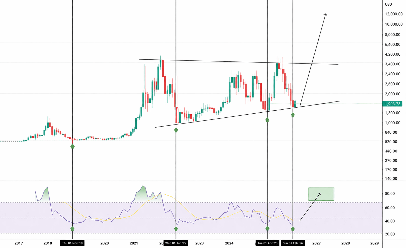 Zooming out, Ethereum has been trading within a high-timeframe range for nearly five years — a prolonged accumulation zone, repeatedly testing both the highs and lows without a decisive breakout.