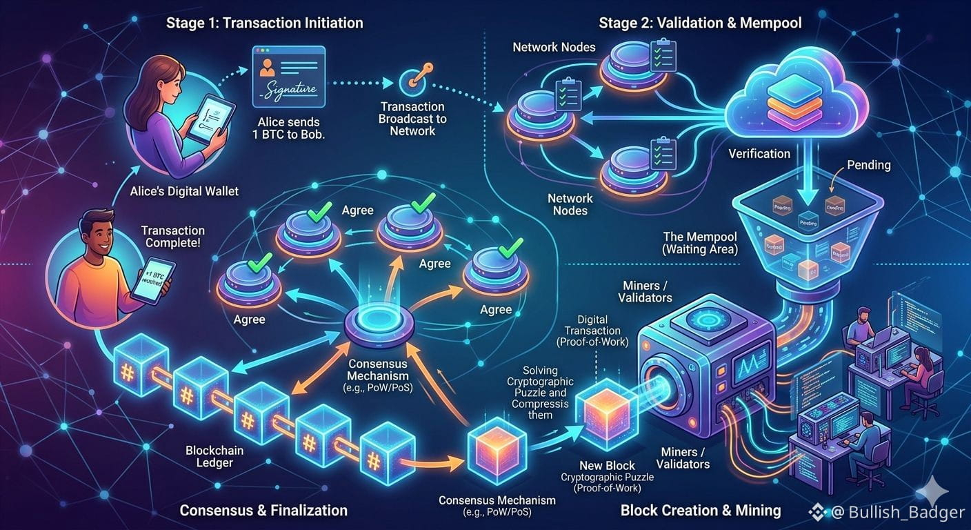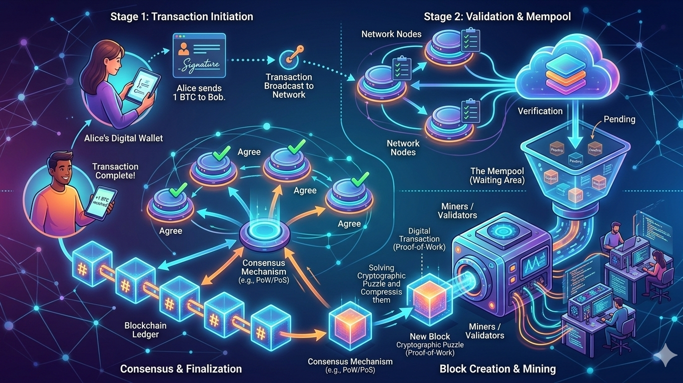 When a transaction occurs (e.g., Alice sends 1 Bitcoin to Bob), it typically follows these steps: