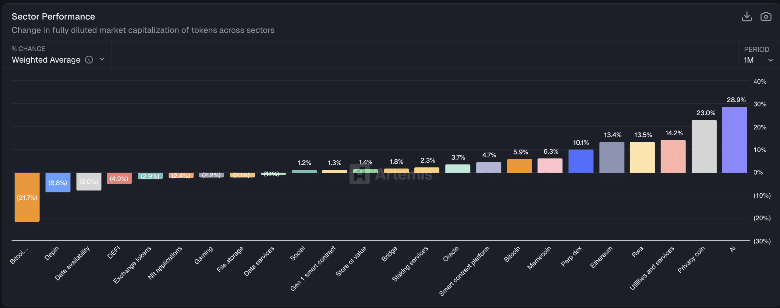 TAO不仅在自身表现出色,还在整个人工智能板块中处于领先地位。根据Artemis数据,过去一个月人工智能板块整体上涨了28.9%,成为加密市场表现最好的板块,超过隐私币(23%)、实用工具币(14.2%)和以太坊板块(13.4%)。
