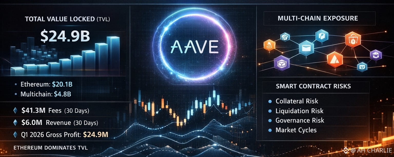 DefiLlama shows Aave V3 with roughly $24.9 billion in TVL, with Ethereum carrying about $20.1 billion by itself, then a long tail across Arbitrum, Base, Mantle, Avalanche, BNB Chain, Polygon, Gnosis, Optimism, Linea, Sonic, Scroll, zkSync Era, Metis, Soneium, X Layer, Fantom, and Harmony. Token Terminal’s overview also shows about $41.3 million in fees and roughly $6.0 million in revenue over the last 30 days. That is not tiny. That is not fake traction. That is a protocol with actual weight.