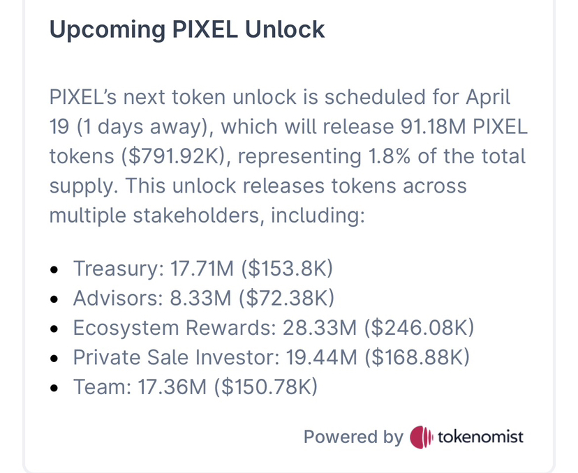 On April 19 literally tomorrow 91.18 million PIXEL tokens unlock. That’s $717K worth of supply hitting the market across Treasury, Advisors, Ecosystem Rewards, Private Sale investors, and Team wallets all at once.