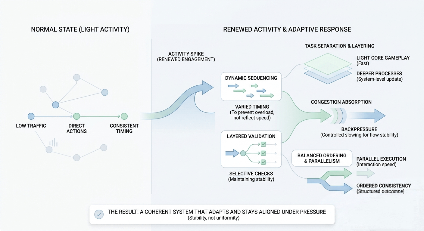 When I look at how @Pixels approaches this, what caught my attention is not just the visible gameplay layer, but how the system seems to behave during moments of renewed activity. It doesn’t feel like a simple content update sitting on top of a fixed structure. It feels more like a system that becomes active in response to participation itself.