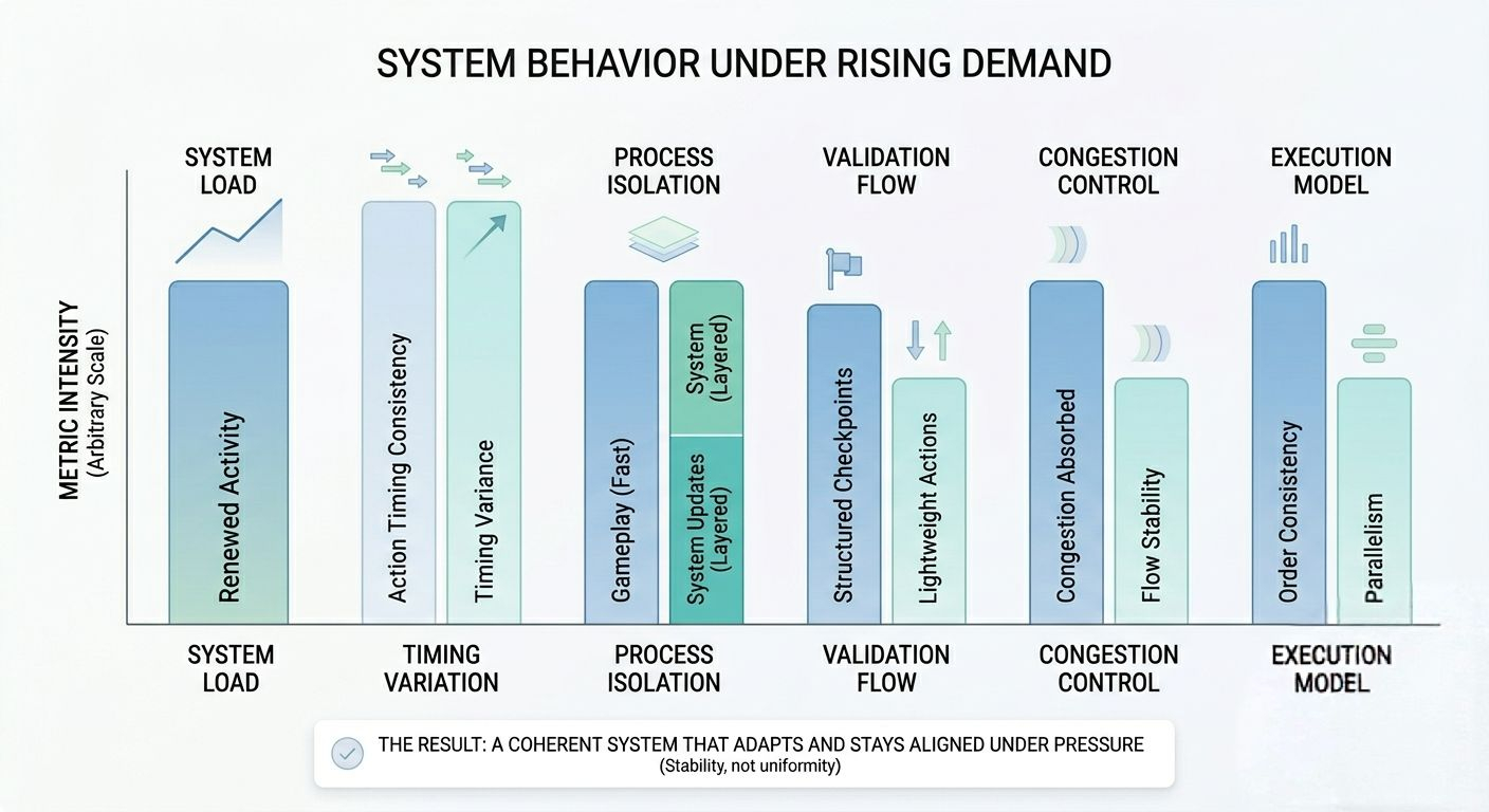 A reliable system is not the one that feels perfectly smooth at all times, but the one that stays coherent when conditions change. Good infrastructure doesn’t draw attention to its adjustments. It simply keeps everything aligned, even when activity comes in waves.