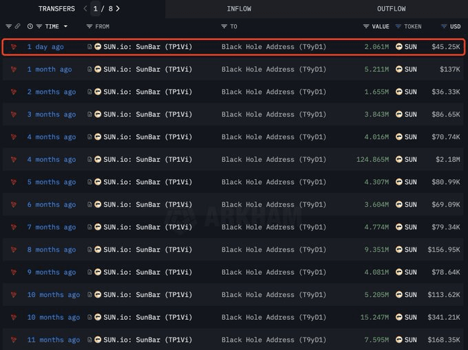 Tra il 9 ottobre e il 3 novembre 2025 (SGT), la piattaforma ha riacquistato e bruciato permanentemente 2.060.843,918 token SUN, del valore di circa $45.000.