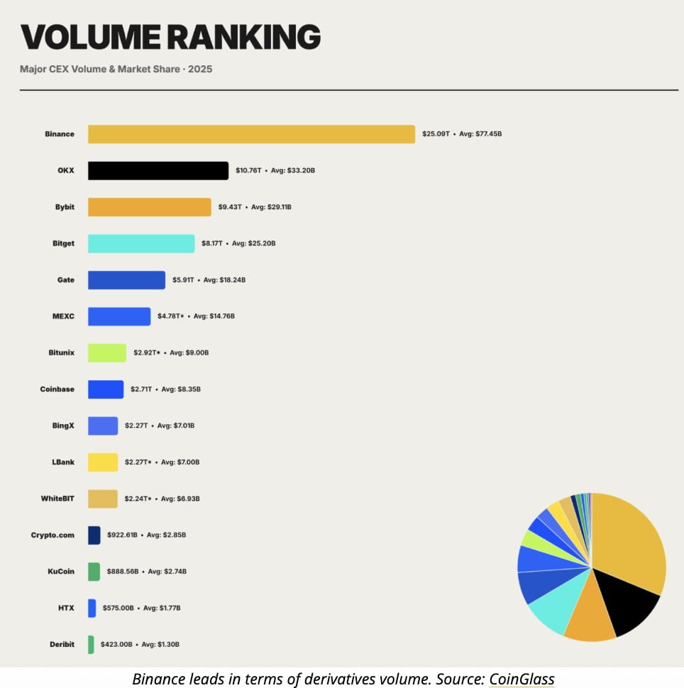 Binance è rimasta il chiaro leader nel trading di derivati crypto, elaborando $25,09 trilioni di volume cumulativo nel 2025 — circa il 29,3% di tutta l'attività globale dei derivati.