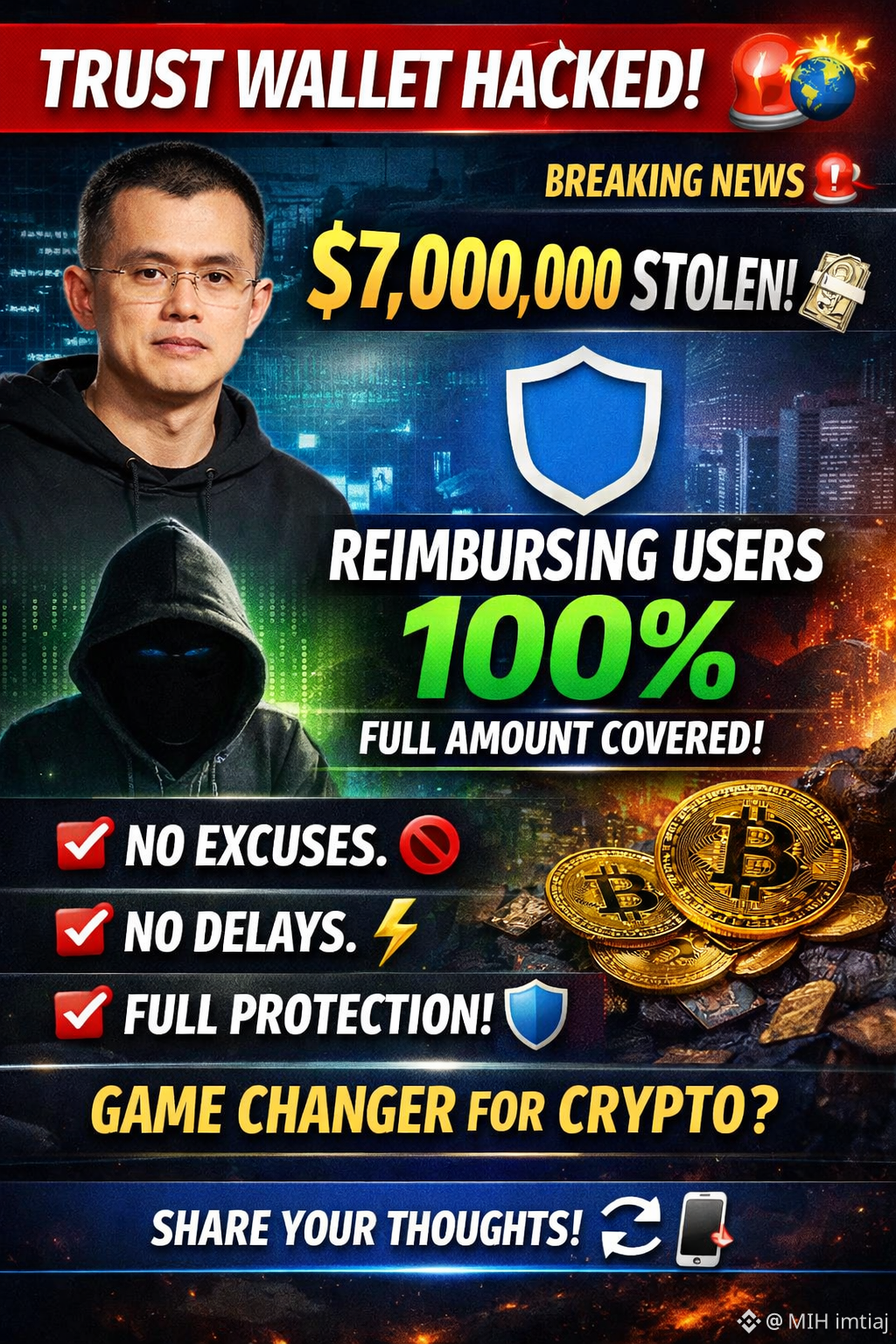 According to CZ, Trust Wallet will reimburse 100% of the stolen funds, ensuring that every affected user is fully compensated 💪🛡️