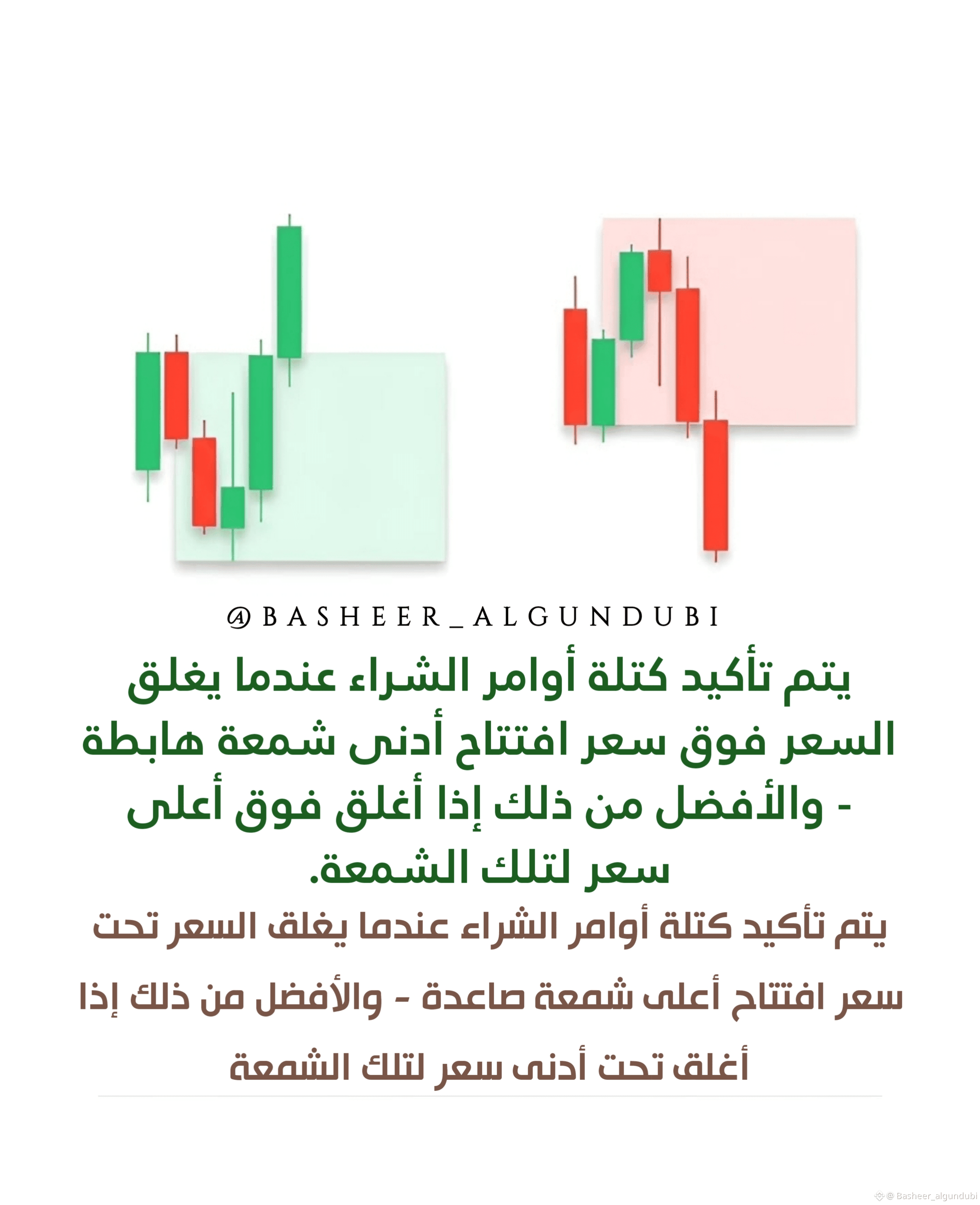 يتم تأكيد كتلة أوامر الشراء عندما يغلق السعر فوق سعر افتتاح أدنى شمعة هابطة - والأفضل من ذلك إذا أغلق فوق أعلى سعر لتلك الشمعة.