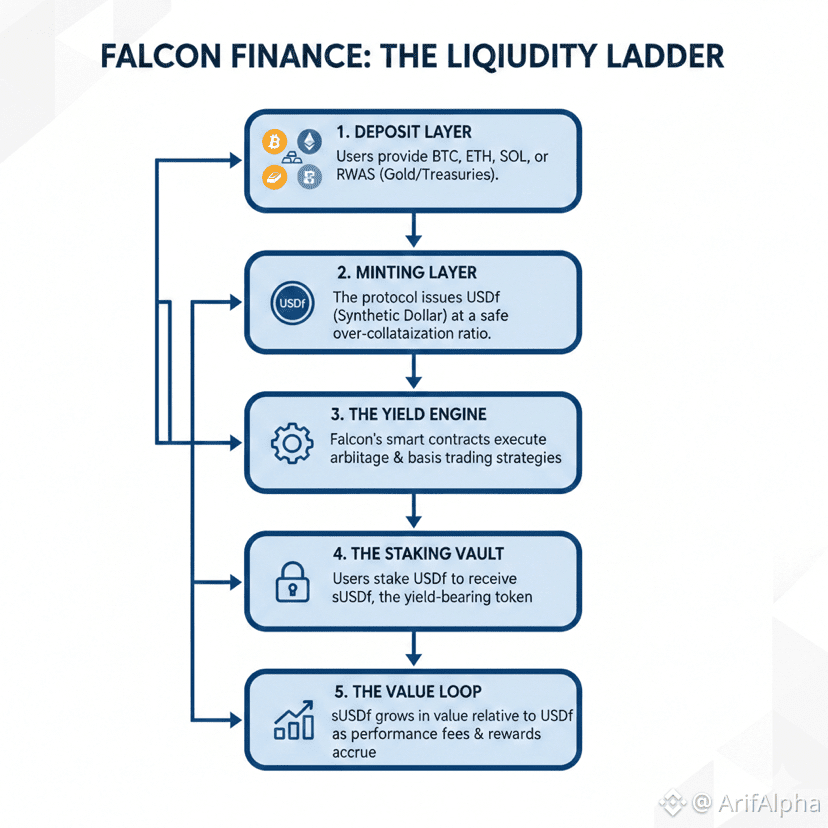 To understand the flow of the Falcon ecosystem, visualize this "Liquidity Ladder":