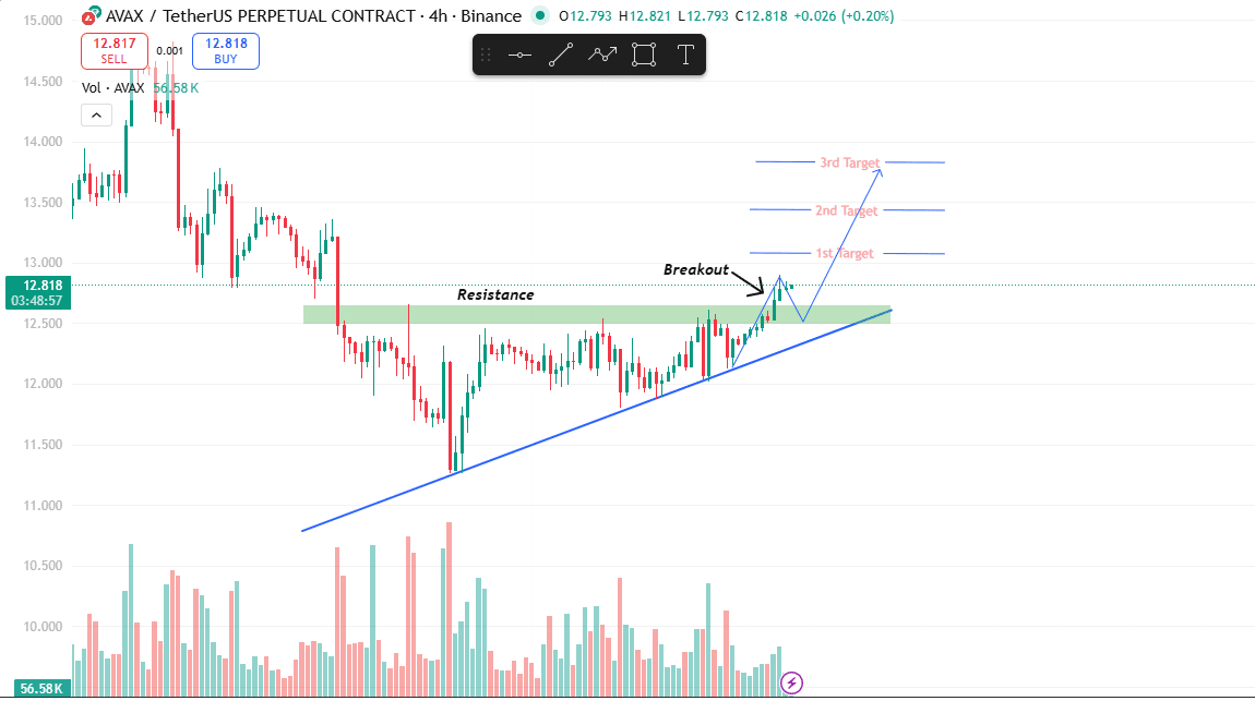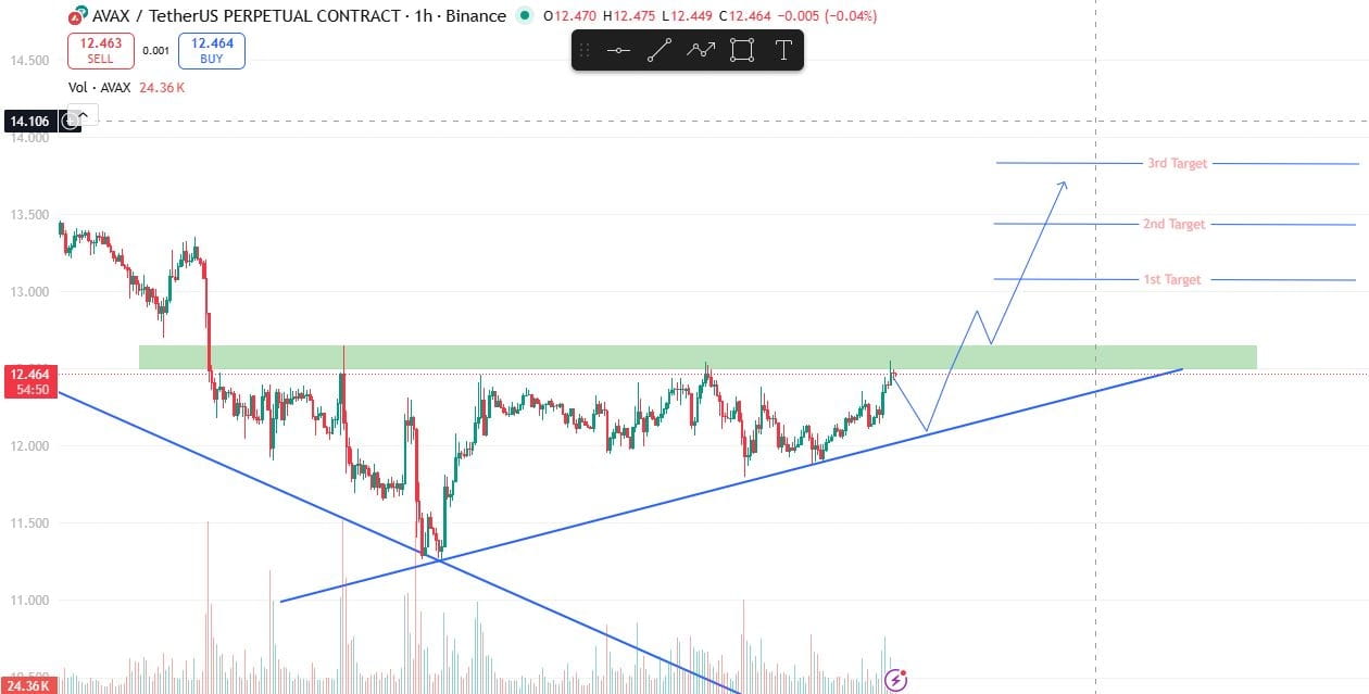 AVAX sta formando un triangolo ascendente dopo una forte vendita, mostrando minimi crescenti (struttura rialzista). Il prezzo ha rotto la resistenza e sta cercando di fare un buon rally. Ma ci aspettiamo un retest sano per un miglior ritorno.