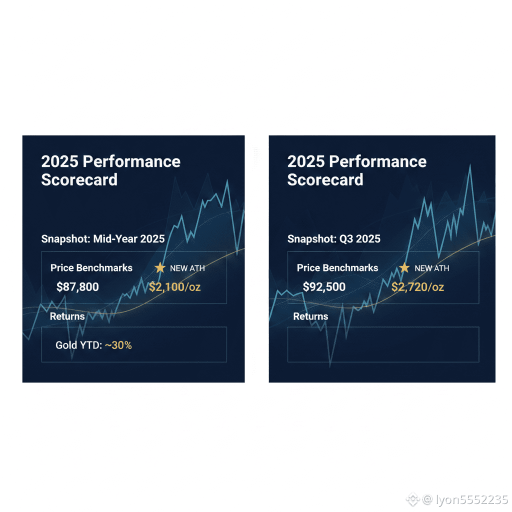 Price Benchmarks: Bitcoin is shown at $87,800 in one graphic and $92,500 in another. Gold is listed at $2,720/oz and $2,100/oz, with both reaching new All-Time Highs (ATHs).