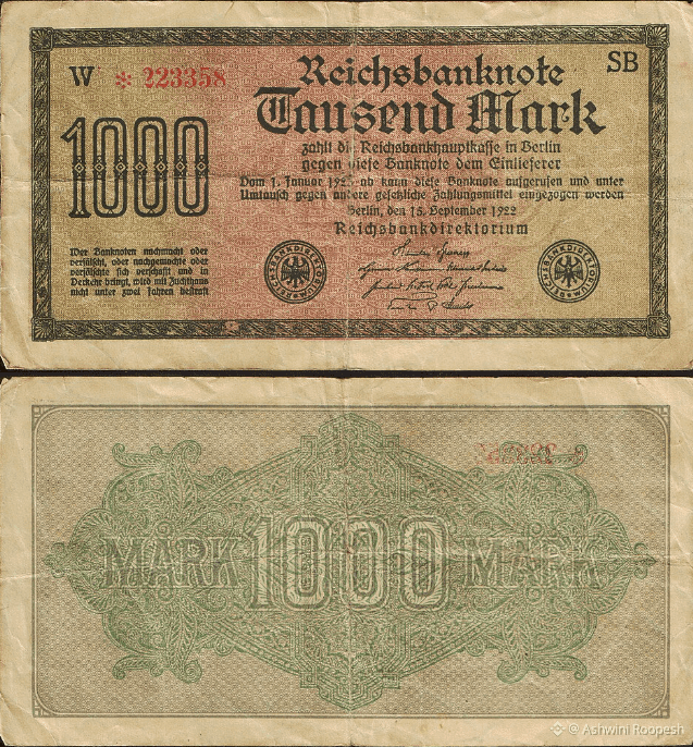 Ipereinflazione (1922-1923): La situazione è deteriorata all'inizio dell'era della Repubblica di Weimar. Per pagare i lavoratori in sciopero durante l'occupazione francese e belga della Ruhr, il governo stampò ancora più denaro, facendo salire i prezzi fuori controllo. Il valore della valuta è deteriorato rapidamente: All'inizio del 1922, 1 dollaro americano valeva circa 160 marchi e nell'anno successivo 4,2 trilioni di marchi.