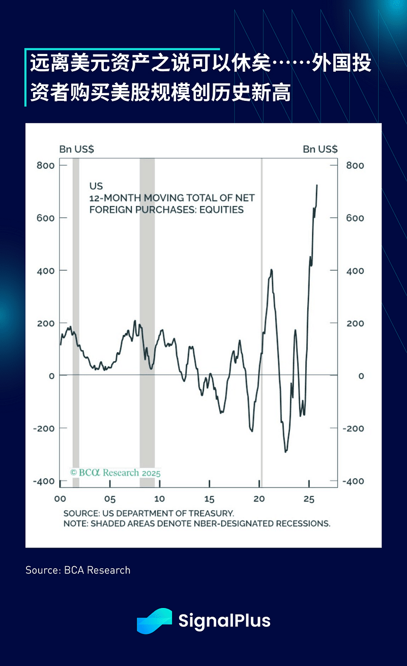 In primo luogo, nonostante le continue preoccupazioni riguardo alla svalutazione del dollaro e all'abbandono del mercato azionario statunitense (ah! ah!), l'importo cumulativo annuo degli investitori stranieri che hanno acquistato azioni statunitensi al termine del 2025 ha raggiunto un record storico.