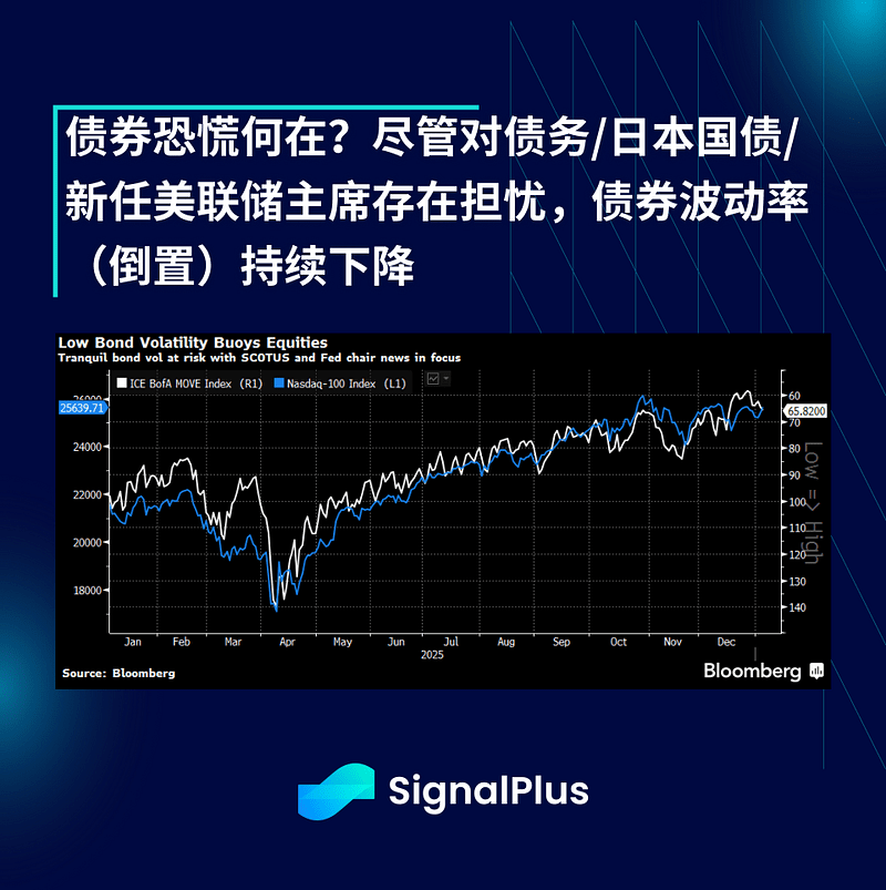 In ultimo, la riduzione della volatilità e della correlazione è un altro segnale. Con l'ampiezza dei rialzi e ribassi azionari in miglioramento, la correlazione implicita continua a scendere, e una minore volatilità macroeconomica sta contribuendo a spingere i prezzi in alto. Nonostante i continui allarmi sul crescente debito non coperto e sull'aumento dei rendimenti dei titoli di Stato giapponesi, la volatilità implicita dei titoli di stato si è chiusa a fine 2025 a un minimo storico.