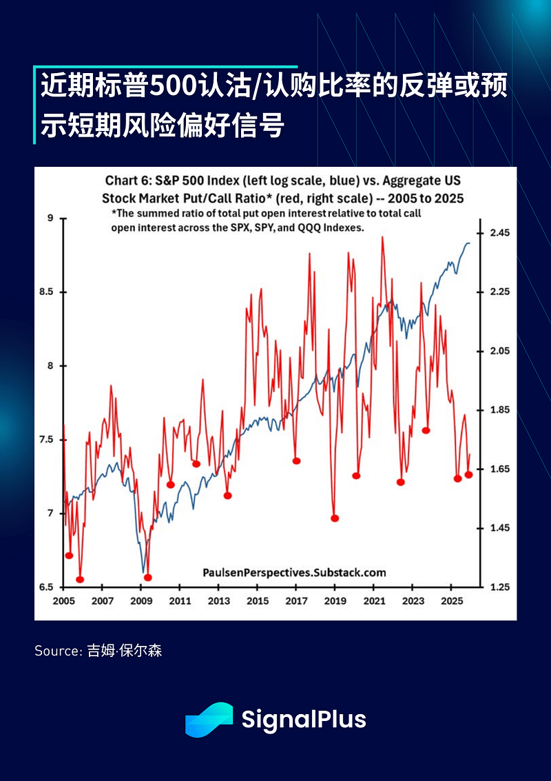 In secondo luogo, nonostante l'ingresso massiccio di capitali, mentre gli indici continuano a raggiungere nuovi massimi, il rapporto put/call dello S&P 500 rimane costantemente basso (un segnale di prudenza). Storicamente, i rialzi di questo rapporto (punti rossi nel grafico) sono spesso segni premonitori di un forte aumento della propensione al rischio nel mercato azionario, e ne abbiamo osservato uno già alla fine dell'anno scorso. (Tutto grazie alla ricerca di Jim Paulson)