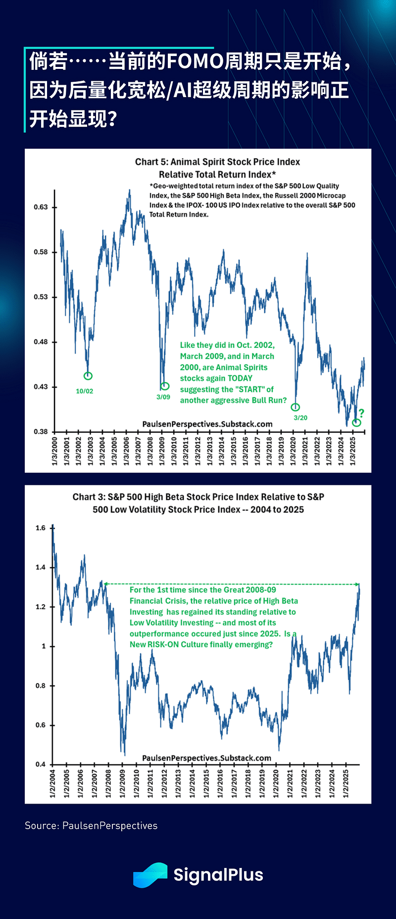 In terzo luogo, potremmo essere testimoni di un cambiamento significativo nello spirito animale. Negli ultimi tempi, le azioni ad alto beta, di bassa qualità, di piccole capitalizzazioni e le nuove IPO hanno mostrato un rendimento eccellente, riprendendo davvero il comando e generando rendimenti superiori. I grafici a lungo termine suggeriscono che potremmo assistere a un rialzo strutturale guidato dal FOMO (paura di mancare) e dallo spirito animale — potrebbe essere il risultato concreto di un superciclo di intelligenza artificiale di lungo periodo e dell'influenza di potenze superprotettive?