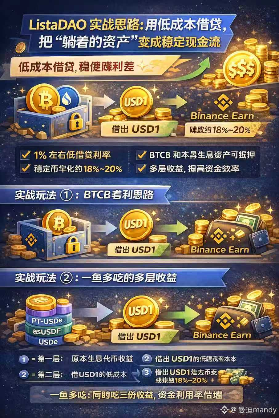 如果你手里有 BTCB、ETH、BNB,或者本身就在持有 USDe、asUSDF 这类资产,又一直在找一个相对稳的收益思路,那 Lista DAO 这种低借贷成本的设计,确实值得认真研究一遍。不是为了短期刺激,而是为了把原本闲置的资产,用得更聪明一点。@ListaDAO #USD1理财最佳策略ListaDAO $LISTA