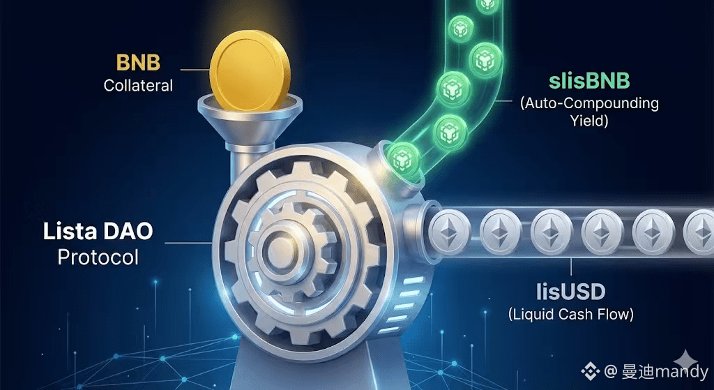 以前我们质押 BNB 去跑节点收益,就像是把钱存了定期,利息是有了,但本金被锁死了,外面有再好的机会你也只能干瞪眼。而 Lista 的玩法很聪明,它把“借贷”和“质押”揉在了一起。当你把 BNB 存进去,它先给你一个凭证叫 slisBNB,这个凭证本身就在自动赚取质押收益。但这只是第一步,最妙的是,你还可以把这个 slisBNB 再抵押在平台里,借出 lisUSD(一种去中心化稳定币)。