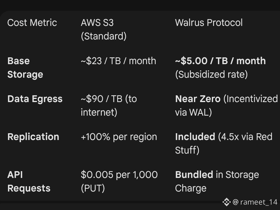 The "Egress Trap": On AWS, moving 100TB of data out of your bucket can cost more than the storage itself ($9,000+). Walrus eliminates this bottleneck, making it a "Data Liquidity" layer rather than a data silo.