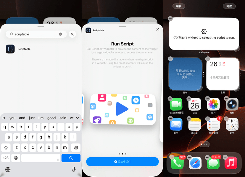 Cerca direttamente 'scriptable' nella barra di ricerca, dopo averlo trovato, scorri verso destra 👉 fino al secondo widget rettangolare, fai clic sul pulsante blu 'Aggiungi widget' in fondo, l’effetto è come segue:
