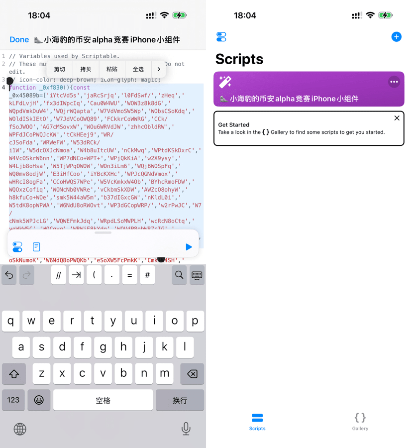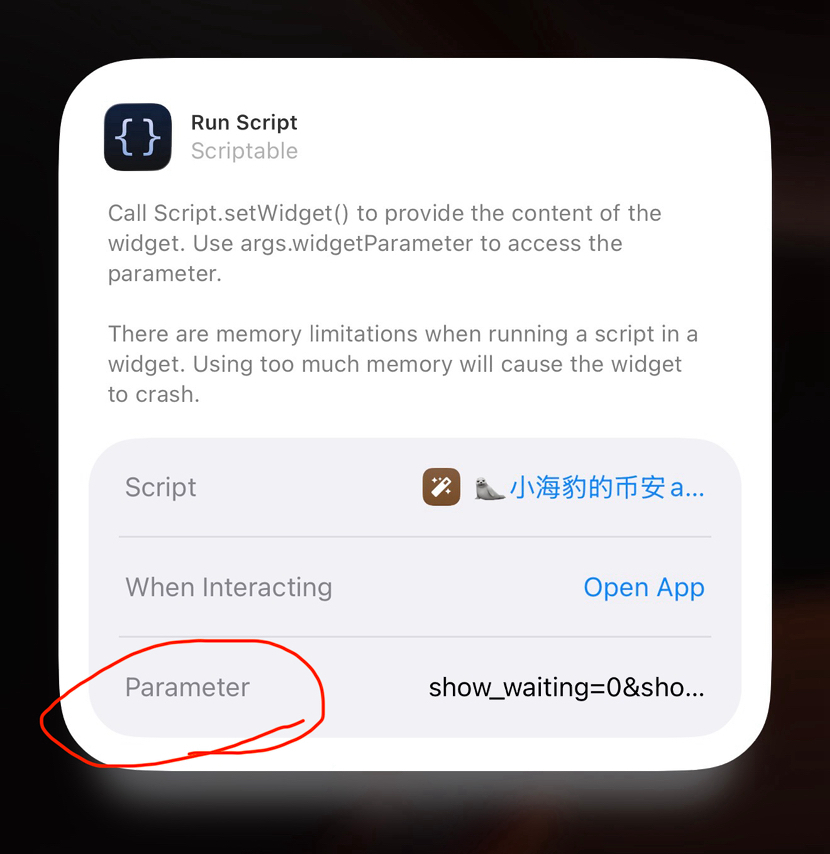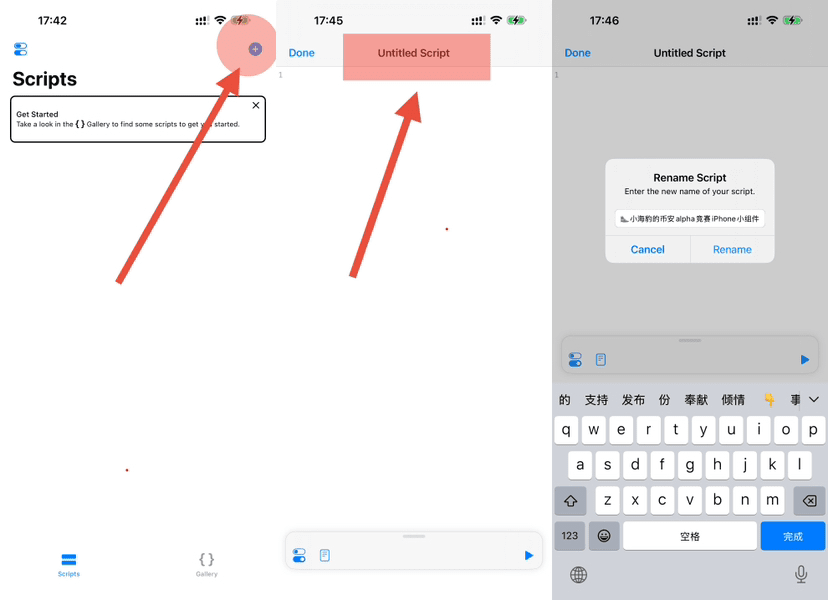 Dopo aver scaricato l'app scriptable, aprila, fai clic sul segno di + in alto a destra, crea uno script vuoto, quindi fai clic sull'area del titolo, dai un nome casuale allo script, ad esempio '🦭widget per la competizione alpha di Binance di piccolo foca':