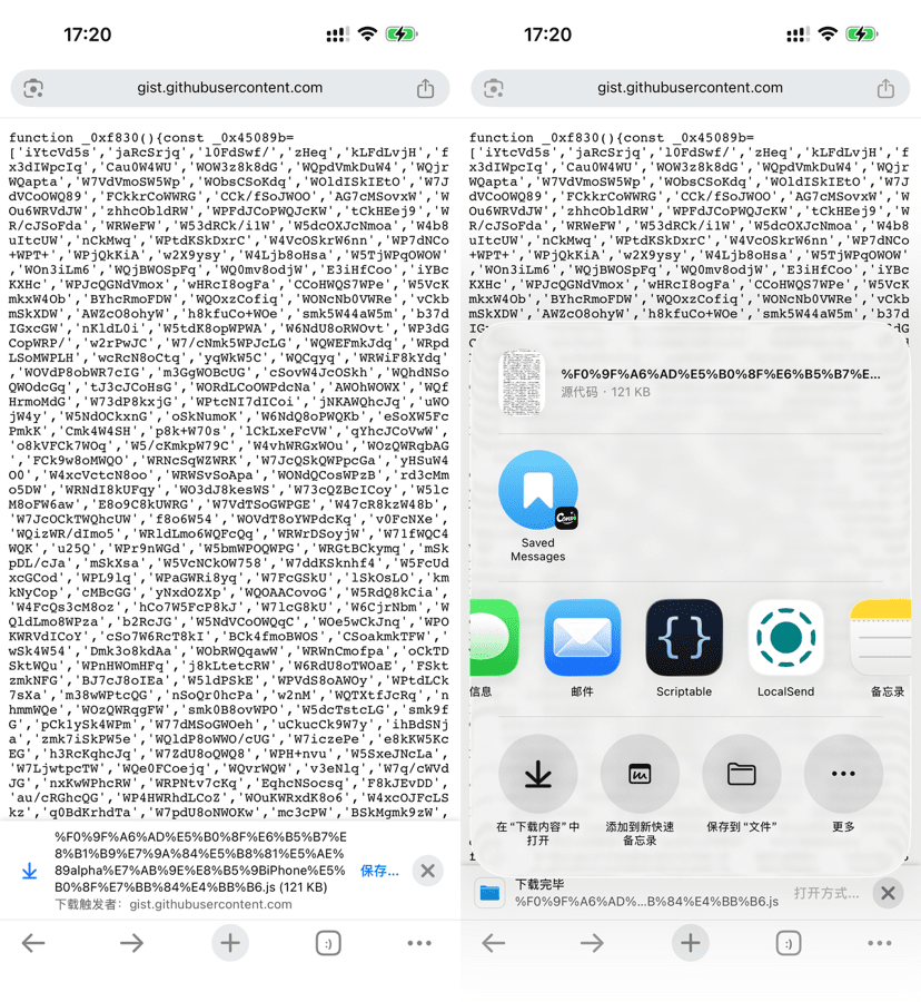 Alcuni browser per smartphone, come Chrome, salveranno automaticamente i file, puoi semplicemente cliccare su salva e poi aprire direttamente con scriptable: