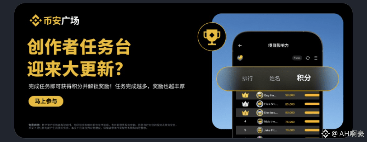 前阵子币安广场迎来了一次大更新,创作者任务台直接大变样,取消了原来的创作者影响力榜单,现在只留有项目榜单了!简单来说就是鼓励用户创作出优质内容然后拿到高额奖励,也就是我们俗称的“嘴撸”!